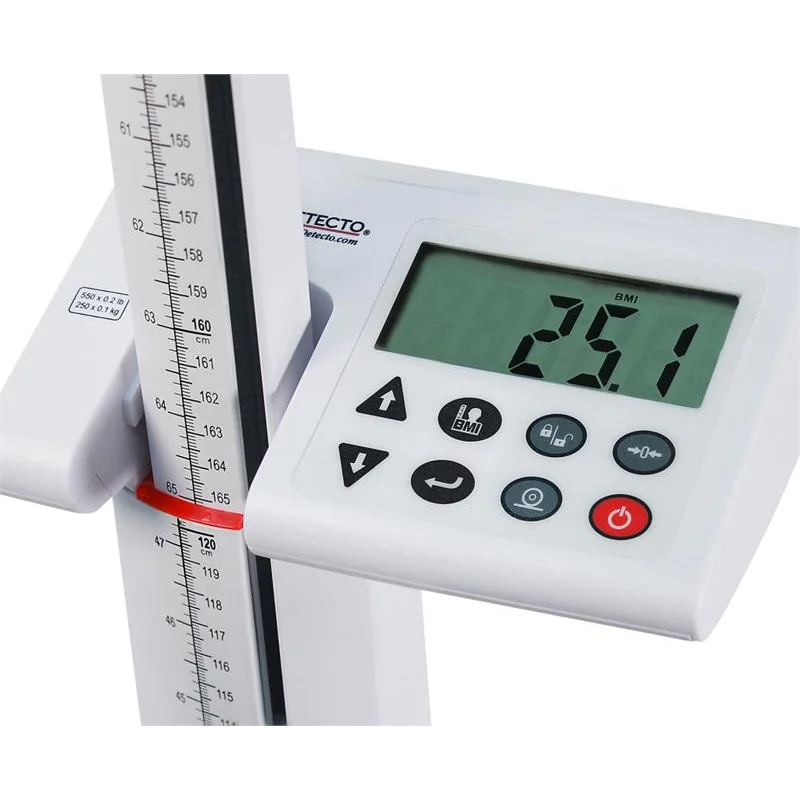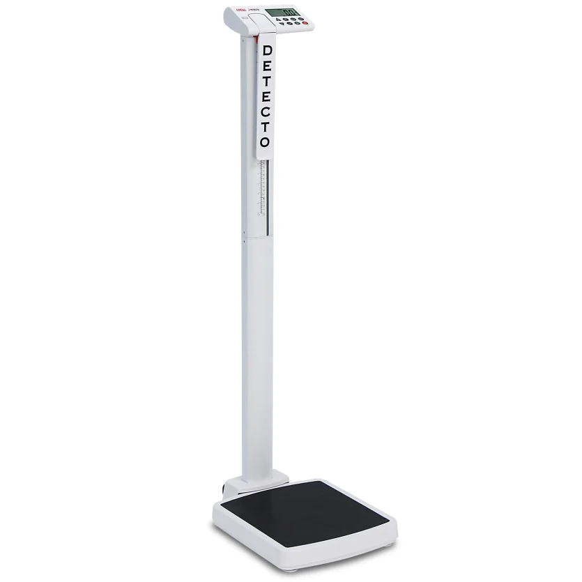 Detecto SOLO Digital Eye-Level Physician Scale The SOLO Eye-Level Clinical Scale from Detecto is a high-quality digital physician scale with mechanical height rod allowing measurement of weight, height, and body mass index (BMI). The SOLO ProDoc Series medical scale is an economical, all-purpose measuring solution for any hospital, physicians office, weight loss clinic, or fitness environment. The oversized, low-profile 14 by 15 inch platform with rubber mat is only 2.4 inches high from ground level, making it easy for patients to step on and off. The SOLO weight scale features a 550 pound (250 kilogram) capacity in 0.2 pound (0.1 kilogram) increments with weight units in both pounds and kilograms. The inline mechanical height rod measures 30 inches to 84.5 inches in height. The eye-level weight display indicator with one-inch-high LCD readouts features 8 simple buttons that are easily identifiable in any language. No power outlet available? The SOLO health scale is powered by 6 AA batteries, which are included, for weighing anywhere in your facility. Or, select the optional PD-AC wall plug-in AC adapter for Detecto ProDoc Series Scales for a constant and consistent power supply. The AC port is located in the base of the mechanical scale, so there are no wires dangling from digital indicator above.