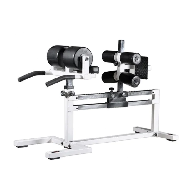 York Barbell Glute / Hamstring Bench – The 54053-55053 Glute / Ham Bench by York Barbell is designed and built for training the glutes, lower back and hamstrings in commercial facilities including school weight rooms, performance training centers and commercial gyms. It is fabricated from 2 x 3 and 3 x 3 x 11 gauge steel that is finished with baked-on powder coating with your choice of white or silver. Dense, large diameter foam rollers offer ample support to the thighs and lower legs while glute/ham training. Vertical roller adjustments are included for front thigh rollers and rear calf rollers for adjusting the angle of the body during training while horizontal adjustments allow up to 29 positions to accommodate different size users. And the included diamond plate footplate provides foot support when training the anterior or posterior of the body.