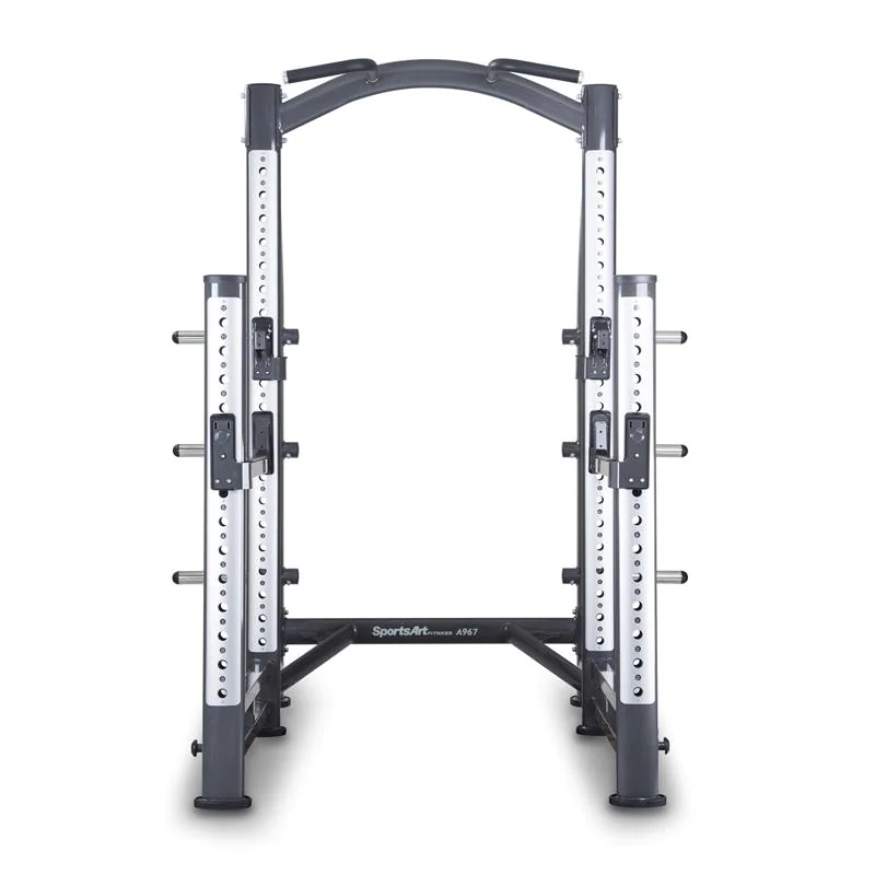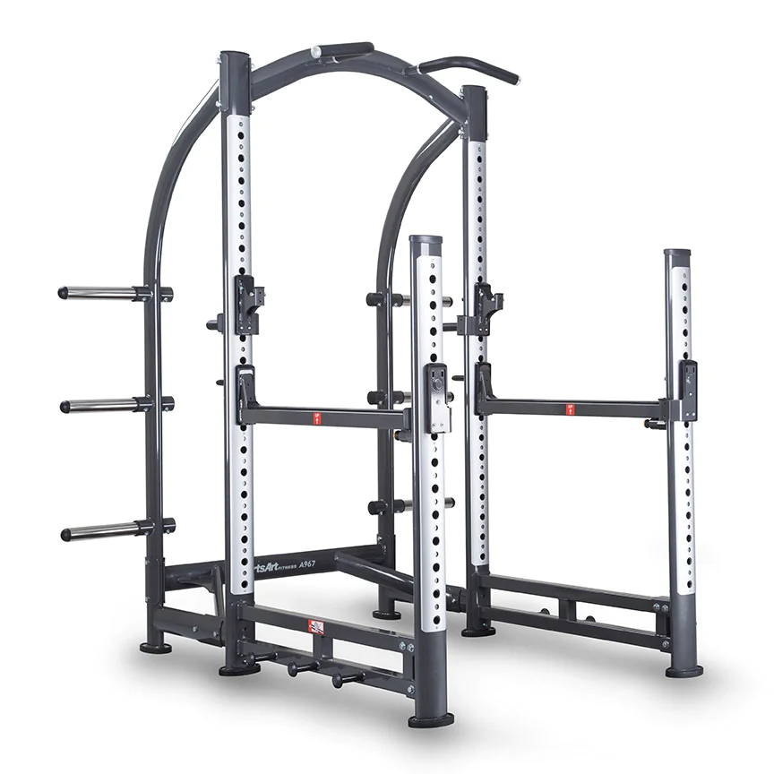 SportsArt A966 Status Series Power Cage – The A967 Half Cage from SportsArt Fitness is a full commercial half rack with open frame design allowing freedom of movement to perform military presses and other overhead lifts during strength training and explosive power training. The SportsArt A967 Half Rack has 14 height adjustment positions on the front uprights and 21 positions on the rear uprights uprights to allow quick and easy custom fitting of bar hooks and safety bar catches to the perfect height for nearly every exerciser engaged in weightlifting and powerlifting. Lower band pegs on each side allow progressive resistance band training for squats and bench press exercises. The exerciser can squat or press overhead without the restrictions of a full enclosed power cage, but with plenty of confidence due to the heavy duty safety catches which are adjustable along the front and rear uprights. Variable grip bar on the front crossmember offers the ability to perform narrow neutral grip chin-ups as well as wider angled pronated grip pull-ups for bodyweight training.