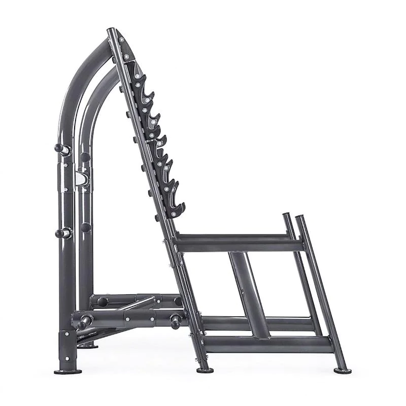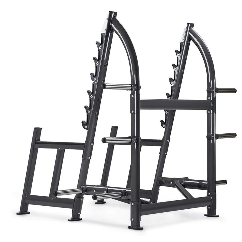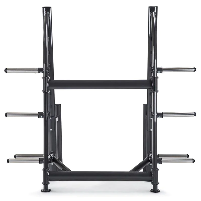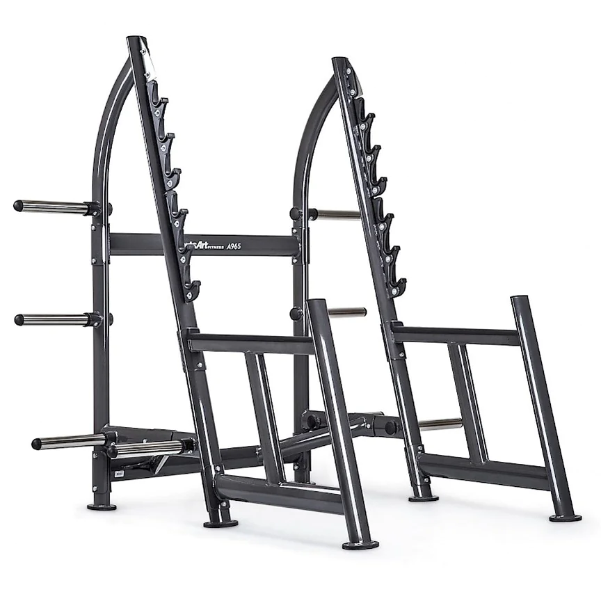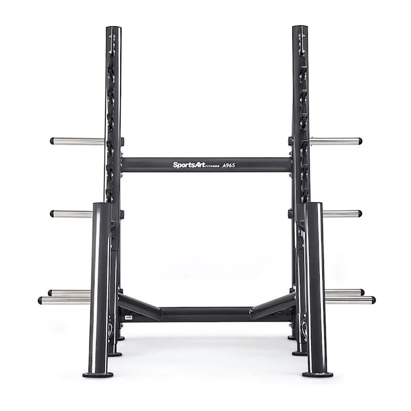 SportsArt A965 Status Series Open Squat Rack – The A965 Squat Rack from SportsArt Fitness is a commercial squatting rack with open design for freedom of movement during weightlifting and powerlifting exercises such as squats and overhead presses. The SportsArt A965 half rack offers six gun rack style bar catches on the angled front uprights for quick and easy bar height adjustments when training with a partner, as well as for racking safely when overloaded or exhausted during a heavy lift. The exerciser can squat or press overhead without the restrictions of a full enclosed power cage, but with plenty of confidence due to the heavy duty safety catches which are part of the main frame structure. The robotically welded 11-gauge steel frame includes stylish, sleek lines and curves created through oval tube steel. The A965 has a 500 pound maximum weight load rating for heavy duty squat training. Major frame pieces bolt together allowing easier transport prior to assembly. Electrostatic powder coating insures the finish is resistant to scratches and dings for a long term beautiful finish. Rubber non-skid feet cover base frame supports to avoid sliding of machine or scratching of floors. Four Olympic-sized weight posts on each side of the rack (8 total) offer generous weight plate storage. All components are commercial grade on SportsArt’s world-class health club strength products to make the A965 Squat Rack perfect for any commercial gym, fitness center, home gym, hotel workout center, personal training studio, or corporate wellness facility. The SportsArt Status Series combines quality and value in a simple, easy-to-use free weight strength line designed to accommodate users of any fitness or experience.
