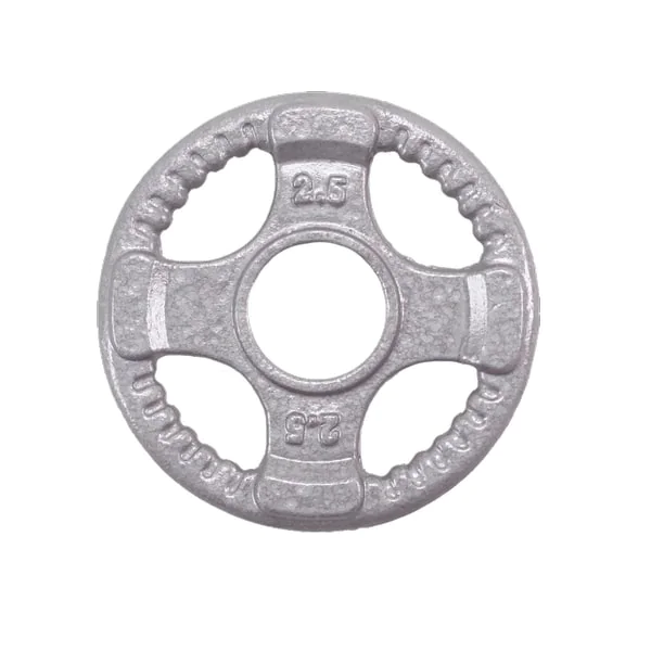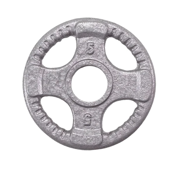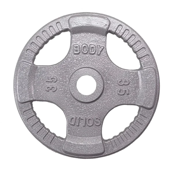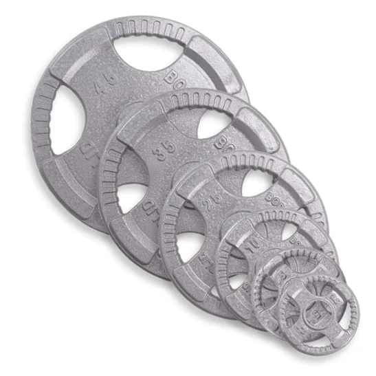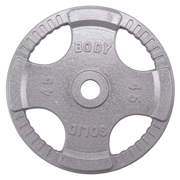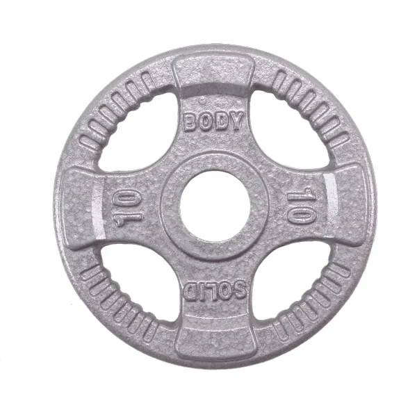 Steel Grip Olympic Plates by Body Solid are as durable as they are functional. All plates are molded from high quality casted iron for a smooth, finished product that is highly accurate (within 2%) in weight. Gray hammertone paint is applied and then baked on to maximize adhesion and long lasting durability. Body Solid weight plates are safe and durable investment for use in garage gyms, school weight rooms