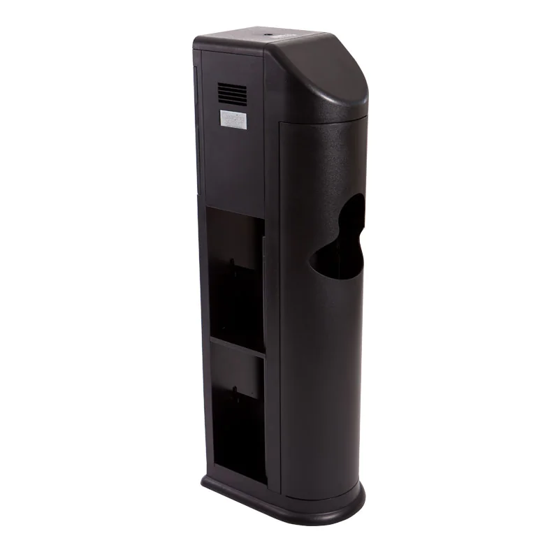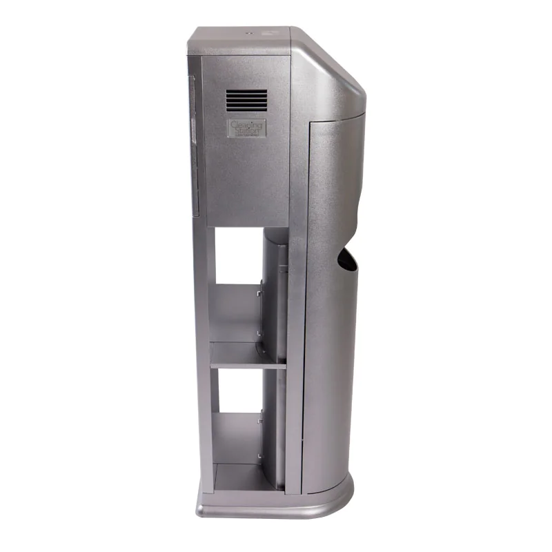 There is no other sanitizing dispenser in the world like The Cleaning Station. Made of solid construction/durable ABS plastic, with a distinctive “D” shaped design and small footprint, it’s the perfect complement to your facility. Interchangeable nozzles allow the flexibility of using a pre-moistened gym equipment wipe or dry towel, easily loaded from the back cabinet. A hidden trash receptacle keeps waste, such as used fitness equipment wipes, out of sight. The shelves offer a storage and organizational solution for all your supplies. To complete its germ protection capabilities, The Cleaning Station houses a hand sanitizer dispenser delivering this exclusive complete system.