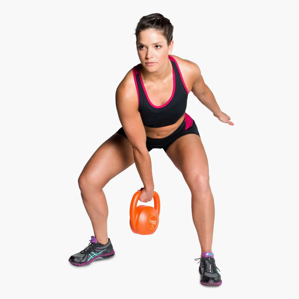 Tone Fitness PVC Coated Cement Kettlebell Set – 30 lbs. – The Tone Fitness Kettlebell Set by CAP Barbell is an economically priced set of 5, 10 and 15 lb. PVC coated kettlebells designed for total body training in the home or fitness studio. Each kettlebell is color coded in purple, green, or orange for quick sizing identification and completely encased in PVC which provides a smooth surface, helps protect floors if dropped and will not flake and rust like cast iron kettlebells can. The three included bells offer safe 5 pound incremental jumps and a weight range appropriate for most people to effectively train their upper and lower body using various proven kettlebell exercises.