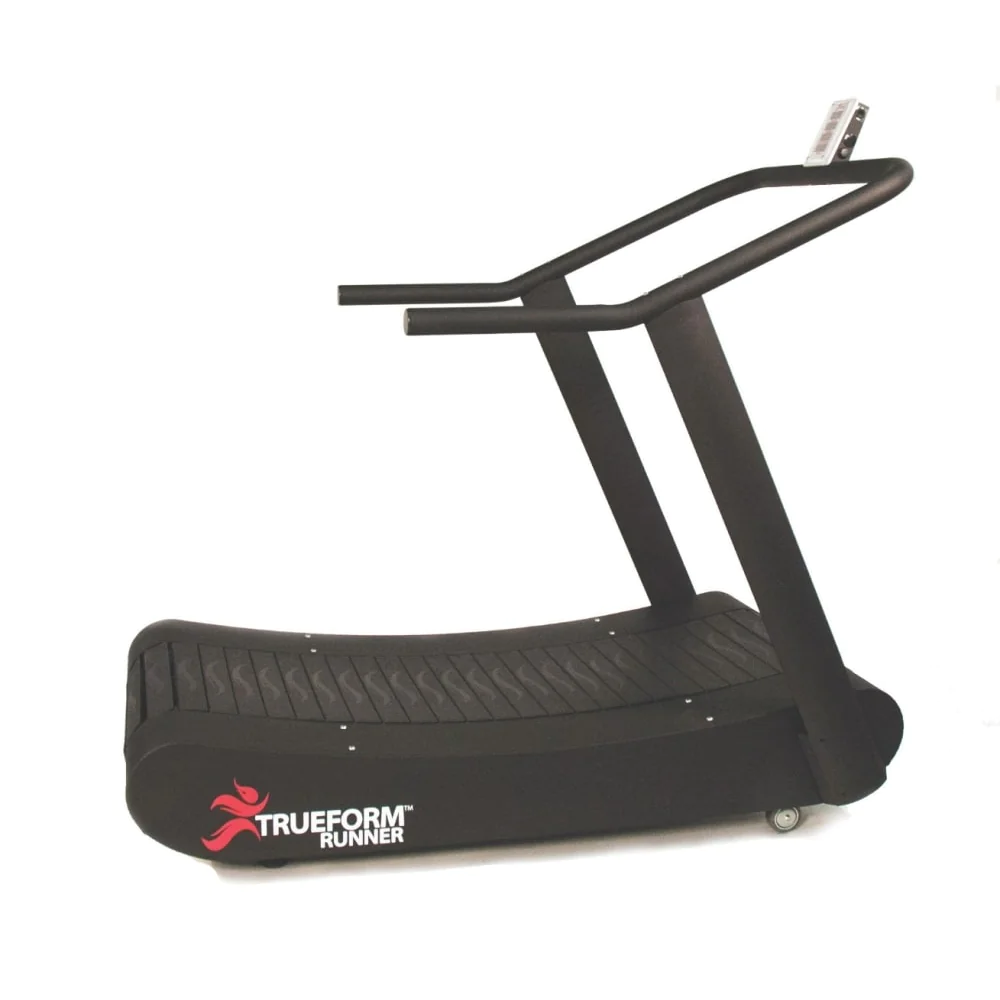 Samsara Fitness TrueForm Runner Non-Motorized Curved Treadmill – The TrueForm Runner by Samsara Fitness is a manually operated treadmill with a curved deck for enhanced performance during running, jogging, and walking. The TrueForm Runner is a non-motorized machine, meaning you have to supply the power that drives the belt, and there are no limitations for top speed. The TrueForm Runner moves as fast as the exerciser can physically go. Unlike standard electric treadmills, the TrueForm Runner self-powered treadmill features an innovative curved deck that is controlled 100% by the movements and force of the athlete using it. It requires that you maintain good posture, and use your core strength, hamstrings, and glutes to drive the belt backwards. It will help you train by rewarding technically-sound posture, body position, balance, and cadence. The TrueForm manual treadmill is engineered to help the user feel the perfect position and teach the skill of running. Receiving instant physical feedback in just a few strides, users will feel any form deficiencies and have the ability to intuitively learn efficient movement patterns. The TrueForm will force the body into the right position during movement. You simply can’t run on it unless you are running correctly. Vulcanized rubber slats provide a firm surface for stable contact and more efficient push-off and gait cycle for healthy, supported form during running. Set your own limits or push right past them. The TrueForm Runner can handle even the most advanced and intense cardiovascular training regimens, creating the nearest simulation of genuine road running.