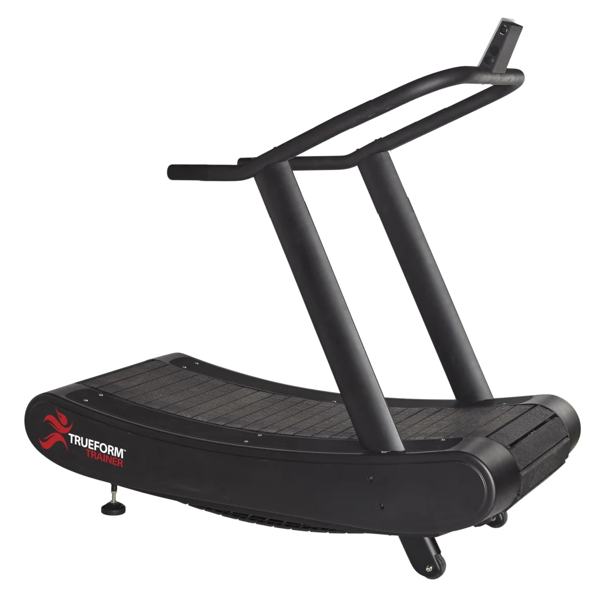 Trueform Trainer Non-Motorized Curved Treadmill – The TrueForm TRAINER by Samsara Fitness is a self-powered, non-motorized treadmill with curved running surface designed for use in any commercial training facility with little to no maintenance needed. The TrueForm Trainer is a rugged, quality-built solution for any commercial gym, military base gym, or garage gym at home. When compared to the USA-made Trueform Runner, the import TrueForm Trainer offers a more affordable treadmill alternative to meet GSA spending budgets, new crossfit box build-outs, and sports training facility equipment proposals. Its lighter weight and compact size make it easy to move and maneuver for competitive sporting events, or for those simply wanting to move it through a standard door at home or at the office. The TrueForm Trainer promotes a true “get on and go” workout, making it simple and user friendly for all ages and skill levels. And, make no mistake, the TrueForm Trainer is still a workhorse of a treadmill, with its steel frame construction and heavy-duty, impact absorbing slatted running surface handling users up to 400 pounds running at top speed!