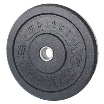 USA Made Recycled Crumb Rubber Bumper Plate Sets – Black crumb rubber bumper plates are produced from recycled crumb rubber heated to a high temperature and vulcanized to produce an extremely durable bumper plate that demonstrates a high tensile strength and tear resistance. This crumb rubber material is much the same as vulcanized rubber deadlifting mats. The rubber durometor, or rubber hardness, is between 75 and 80 for lower bounce during training. A recessed one-piece stainless steel hub is built to last through the toughest Olympic lifting and will not rust or deform. Our solid crumb rubber bumpers are drop tested from a height of 6 for up to 20,000 drops to ensure long lasting durability.