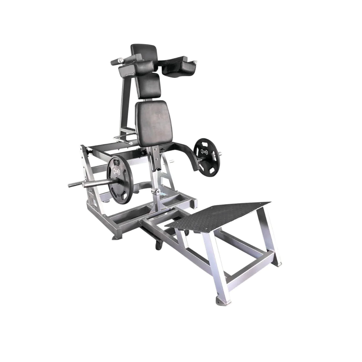 V Squat Machine – Muscle D Fitness (MDP-2007) – The Muscle D V squat is a plate loaded strength training machine designed to add size and strength to the quads, hamstrings and glutes. The V squat, or “vertical” squat, is a great alternative to the barbell squat and eliminates the pain some may experience from the bar resting on the shoulders and neck. The V squat includes head, back and shoulder pads made from thick, closed cell foam padding that holds its shape for maximum support and comfort. The entire carriage is attached via heavy-duty pillow block bearings ensuring the smoothest travel for many years to come. A large foot platform gives users a variety of foot position options depending on what part of the quads they want to isolate. And the built-in safety-stop allows the user to safely exit the machine in case of a missed rep. The entire Muscle D V Squat is built around a frame fabricated from 11-gauge steel tubing and then finished in baked-on platinum powder coat.