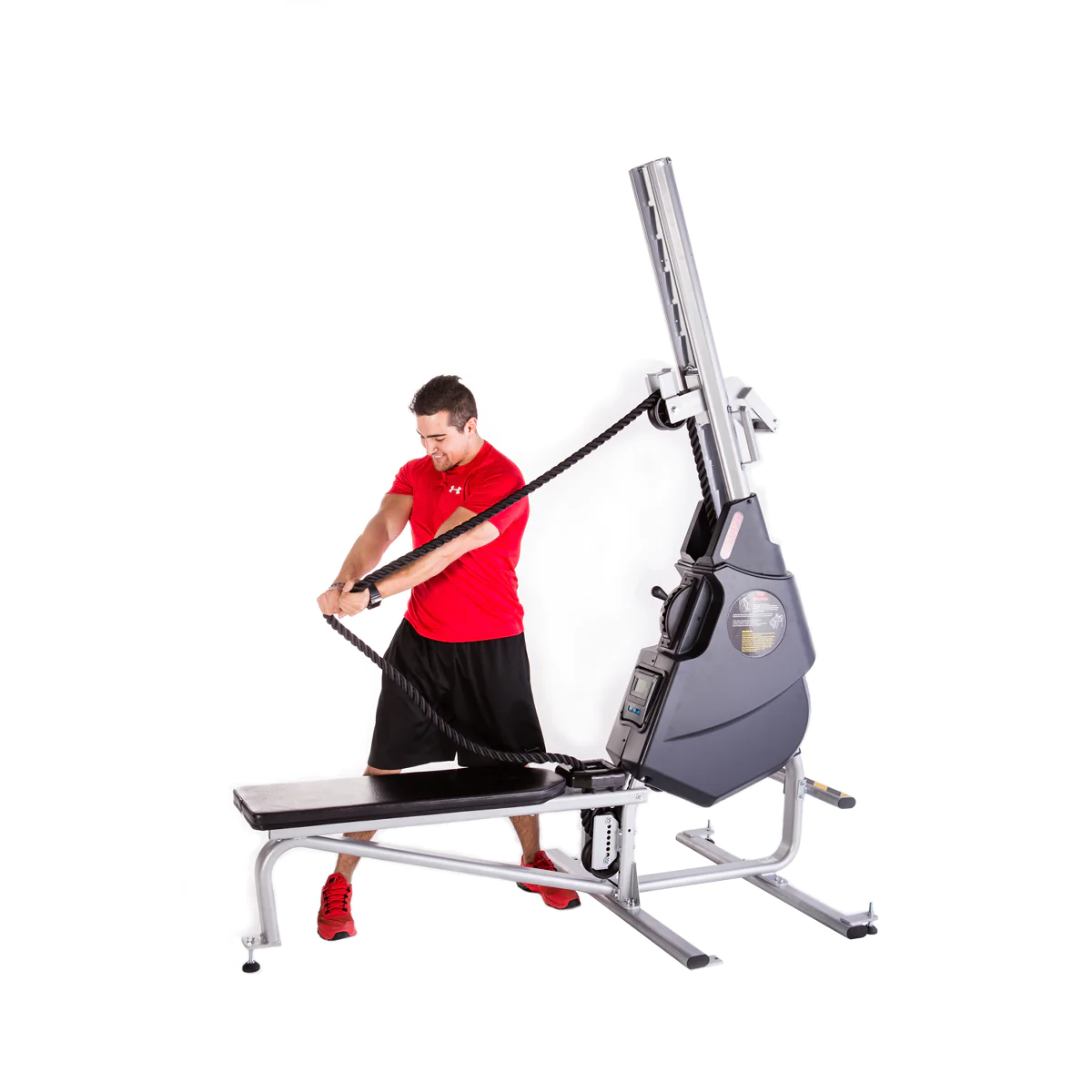 VMX Dynamic Rope Training Machine – MARPO KINETICS (VMX) – The VMX Dynamic Rope Trainer by Marpo Kinetics is similar to the VLT Compact Rope Trainer with the exception of having a permanently attached exercise bench and adjustable pulley. Just squeeze the handle to adjust the pulley carriage to transform the VMX rope machine into a vertical rope climbing simulator or a horizontal rope pulling machine. Three rope exercise modes include vertical, diagonal and horizontal allow dozens of push/pull exercises that target entire body strength, cardio, stretching and are very effective in rehabilitation. The VMX rope workout machine will simultaneously target the upper and lower body. Isolate individual muscle groups like the abs, shoulders and arms similar to weight training. Change out your exercises on the fly by simply standing, sitting or changing your grip. One of the biggest benefits of rope training on the VMX is its dynamic resistance mechanism that constantly adjusts to your pulling power along the entire length of your stroke. This lowers stress on the joints reducing potential for injury while maximizing workout efficiency.