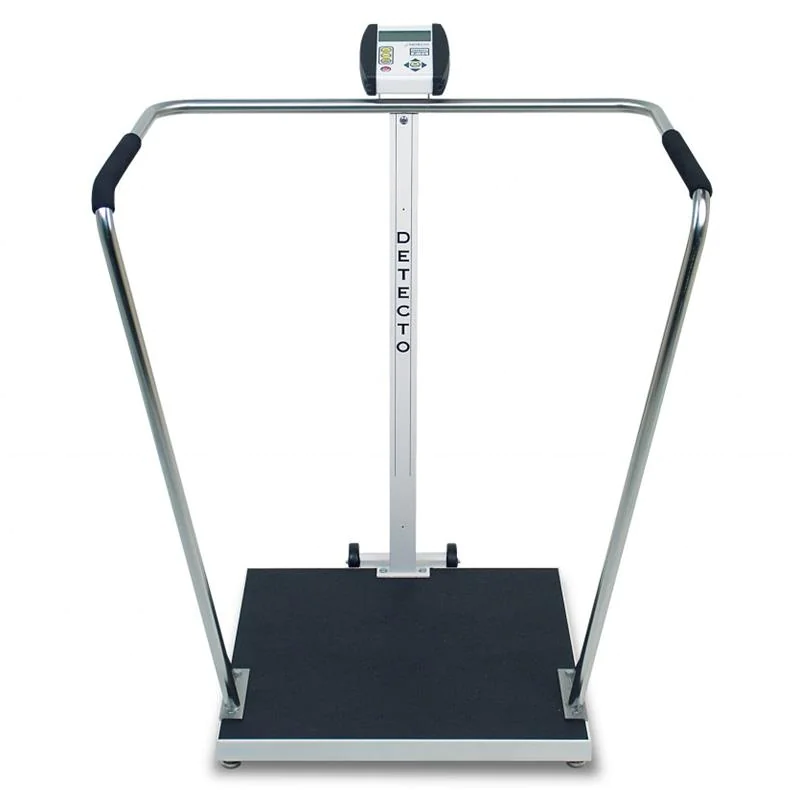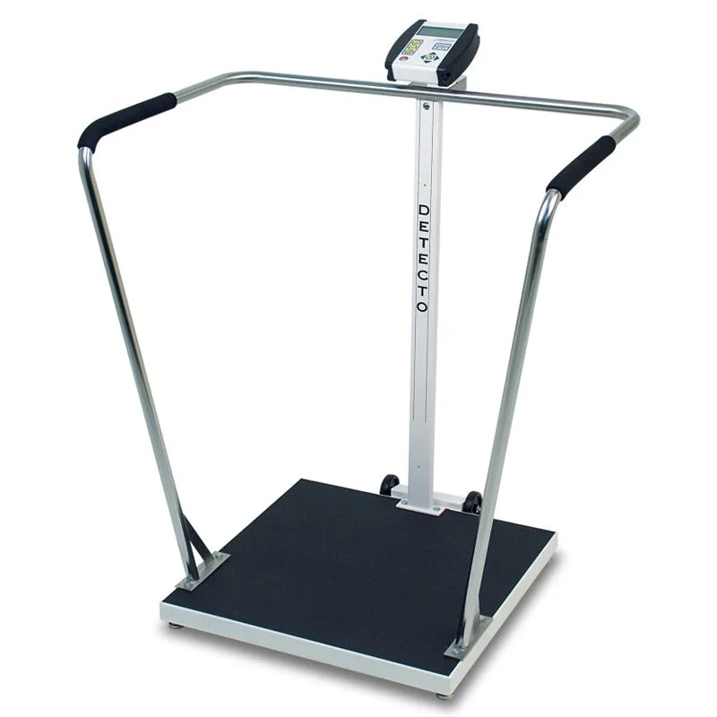 Detecto 6856 Bariatric Waist-High Portable Medical Scale The 6856 Bariatric Medical Scale from Detecto is a stand-on scale with 1000 pound capacity designed for weighing and body mass index calculation of obese and unsteady patients. The low-profile 24 inch square platform, convenient stainless steel handrails with comfortable grips, sturdy steel construction, and skid-proof mat add to patient assurance and stability when used in hospitals, medical centers, and weight loss clinics. The 6856 clinical scale features a balanced, lightweight design. It is easily tipped back for transportation on its hard, large diameter, rubber wheels yet narrow enough to fit through standard doors.
