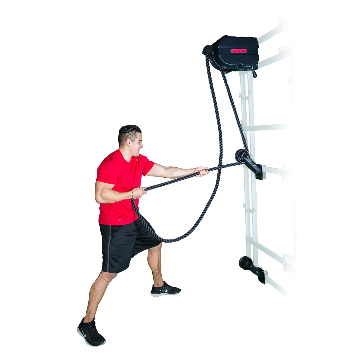 X8 Mountable Compact Rope Trainer – MARPO KINETICS (X8-COMPACT) – The X8 Rope Trainer is a dynamic resistance rope training device designed to be mounted to concrete walls or CrossFit rigs and racks. Because it is mountable, the X8 rope training machine remains up and out of the way of other equipment while not in use. The X8 rope machine is superior to old school climbing ropes, i.e. manila climbing ropes, in that it only requires a ceiling height of about 8’ and the magnetic resistance load ranges from between 2-165 lbs. making rope exercise manageable for all ages and fitness levels. Optional auxiliary pulleys allow the user to quickly change between vertical, diagonal and horizontal pulling and pushing. The Marpo X8 excels in fire departments, schools, military training facilities and commercial gyms.